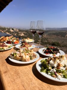 ברנץ׳ בוקר חגיגי במרפסת היקב מול הנוף, עם יין חופשי ופתיחת שולחן עשירה ונדיבה: